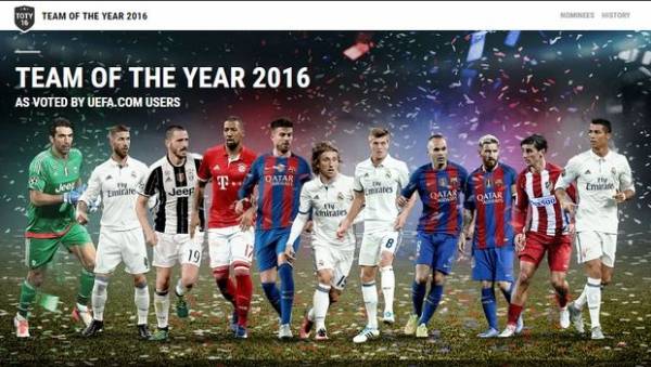 Την κορυφαία ενδεκάδα του 2016, όπως την ψήφισαν οι χρήστες μέσω της επίσημης ιστοσελίδας της UEFA, ανακοίνωσε το απόγευμα της Πέμπτης η Ευρωπαϊκή Ομοσπονδία. Συνολικά, ψήφισαν 649.701 χρήστες, με τους ποδοσφαιριστές της Ρεάλ Μαδρίτης και της Μπαρτσελόνα να κερδίζουν τις προτιμήσεις.