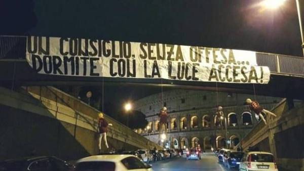 Αποδέκτες μηνύματος μέσω φρικιαστικού τρόπου έγιναν οι ποδοσφαιριστές της Ρόμα, αφού σε κεντρικό δρόμο έξω από το Κολοσσαίο εθεάθησαν τέσσερα κρεμασμένα ομοιώματα, συνοδευόμενα από πανό με άκρως απειλητικό μήνυμα.