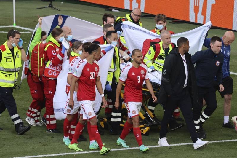 Αρχικά κυκλοφόρησε μια φωτογραφία του Έρικσεν, καθώς έβγαινε από το γήπεδο, να έχει τις αισθήσεις του και να κρατάει το κεφάλι του. Μόλις επιβεβαιώθηκε πως είναι αυθεντική, η UEFA ανακοίνωσε πως ο 29χρονος χαφ της Ίντερ είναι «στο νοσοκομείο και σε σταθερή κατάσταση». Λίγο αργότερα το ίδιο ανακοίνωσε και η ομοσπονδία της Δανίας.