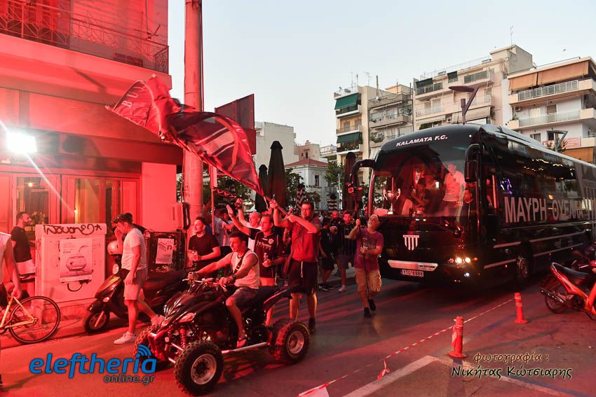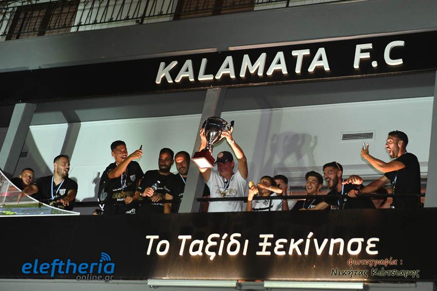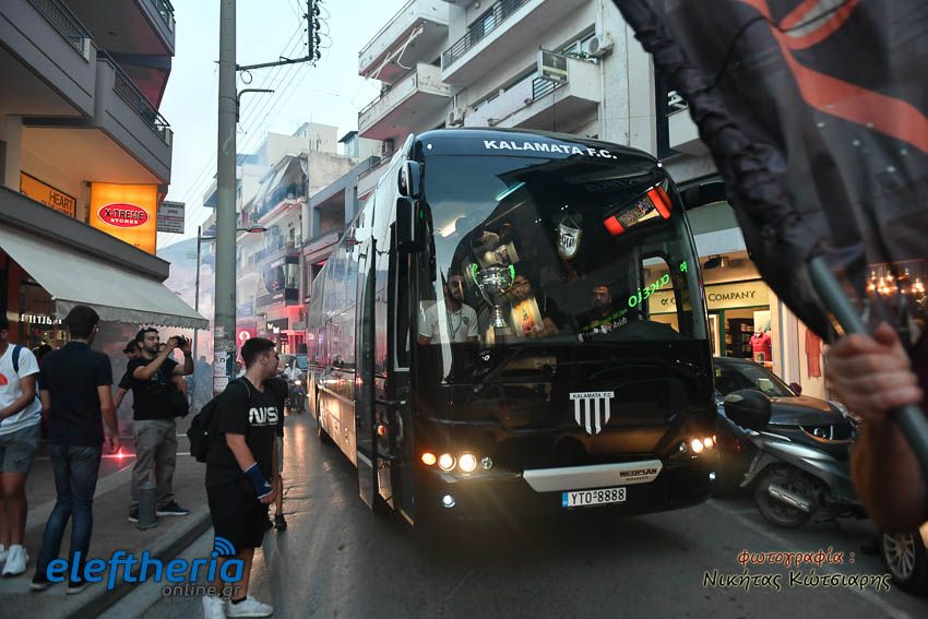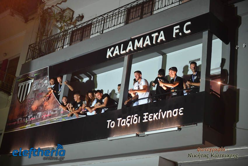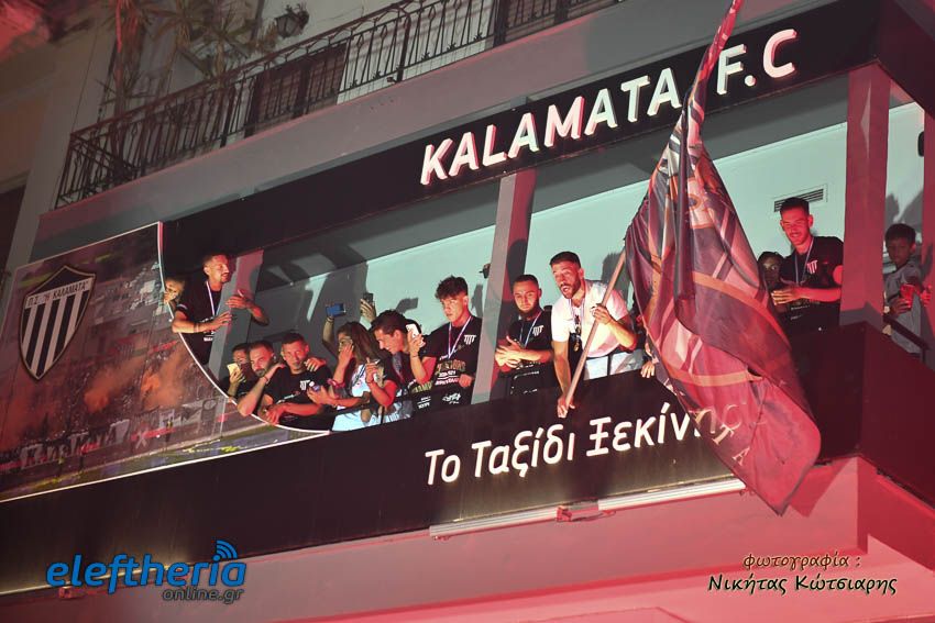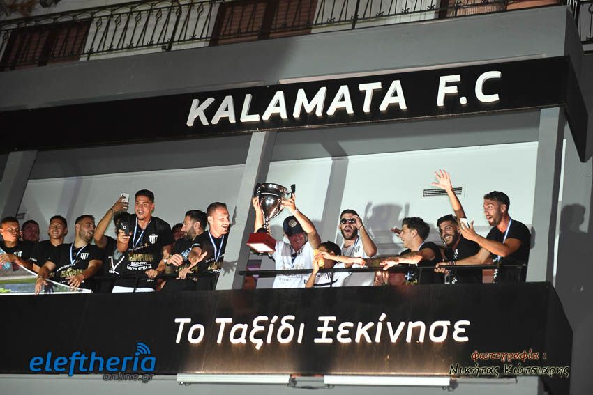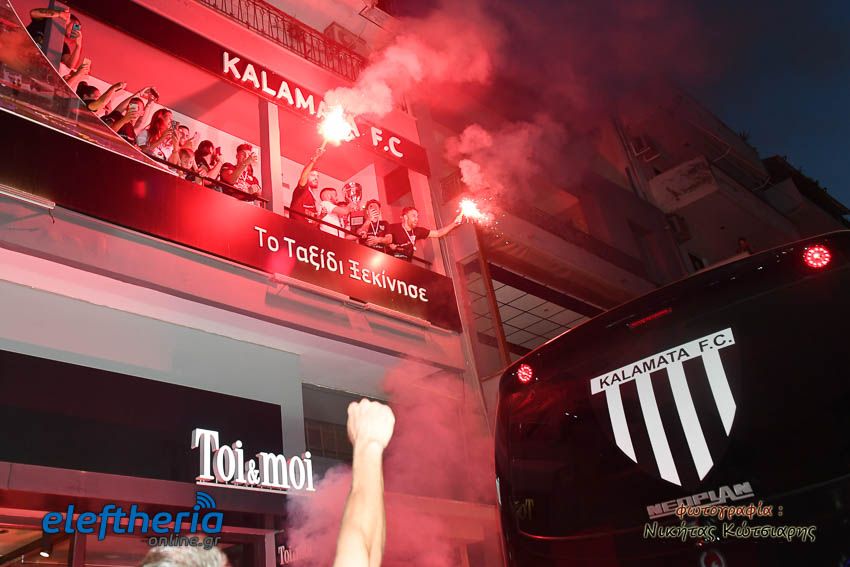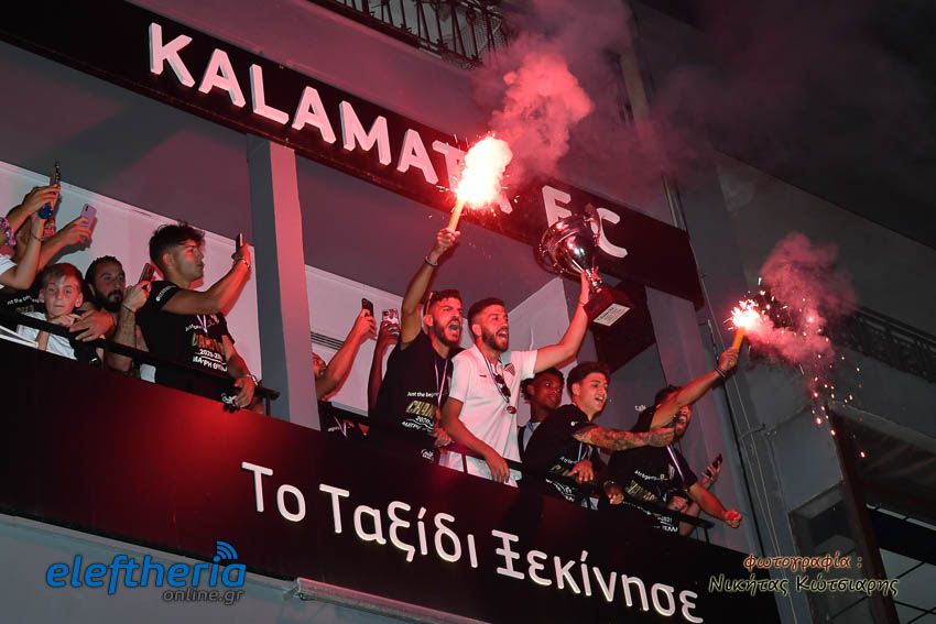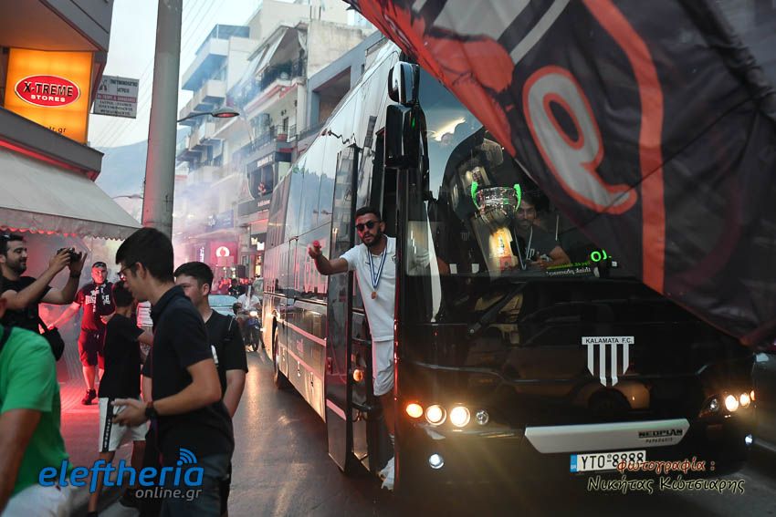 Καπνογόνα, συνθήματα, κορναρίσματα, πανό, σημαίες, συνέθεταν το εντυπωσιακό σκηνικό με τους παίκτες της Καλαμάτας μέσα από το πούλμαν να αποθανατίζουν τις μοναδικές στιγμές. Το πούλμαν αφού έκανε το γύρο της πλατείας, σταμάτησε έξω από τα γραφεία στην Φραντζή, με τη νύχτα να γίνεται... μέρα από τα καπνογόνα. Οι παίκτες ανέβηκαν στα γραφεία και έχοντας το τρόπαιο στα χέρια γνώρισαν την αποθέωση από τον κόσμο που ήταν από κάτω και γιόρταζε τον τίτλο και την άνοδο στη Super League 2.
