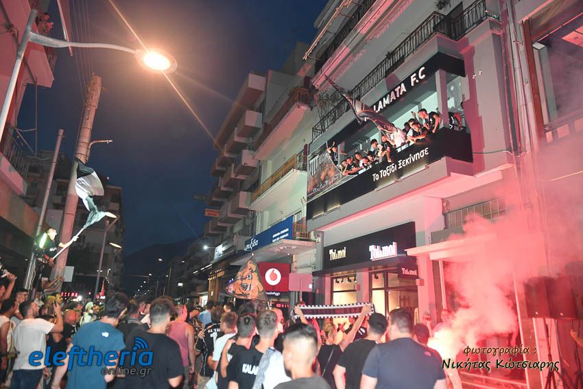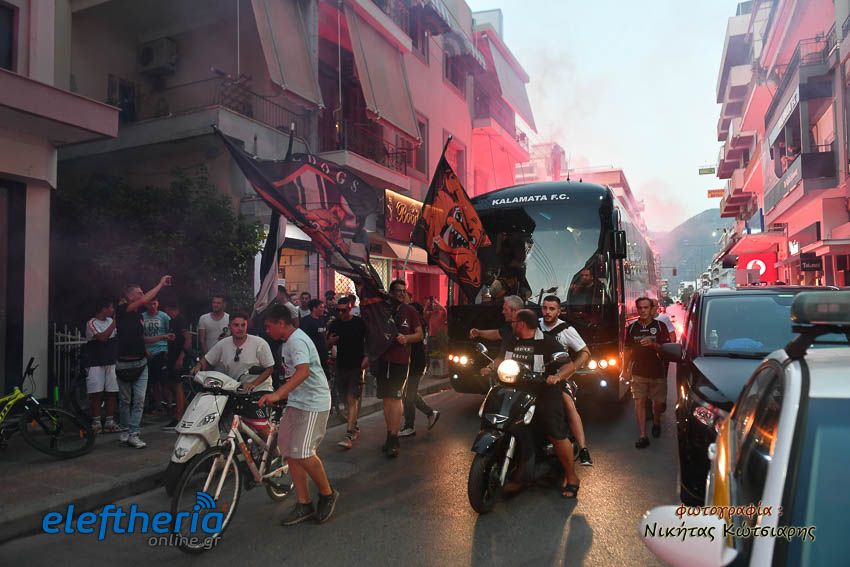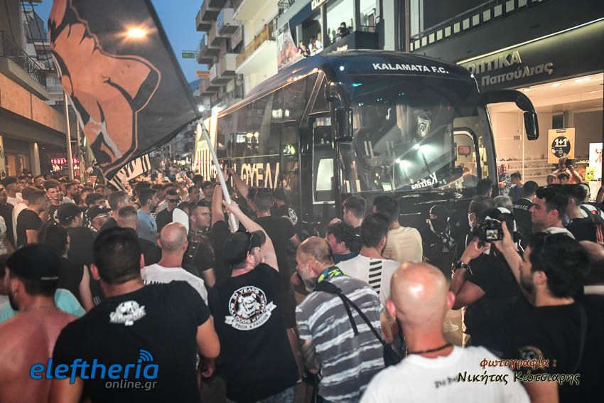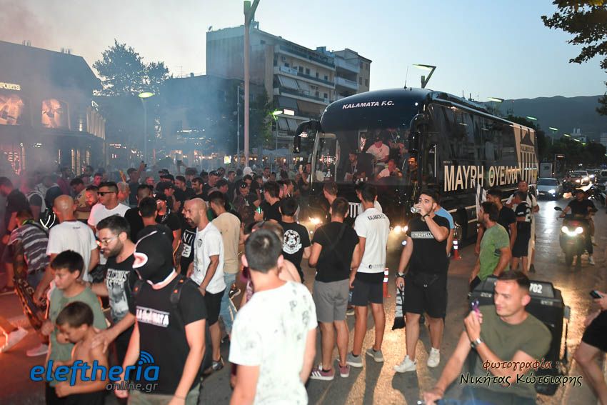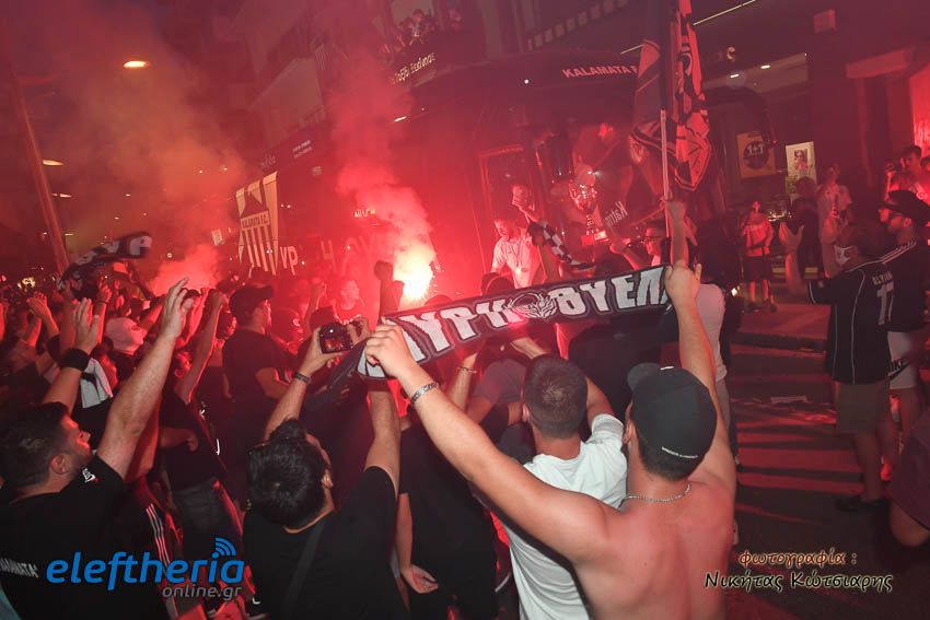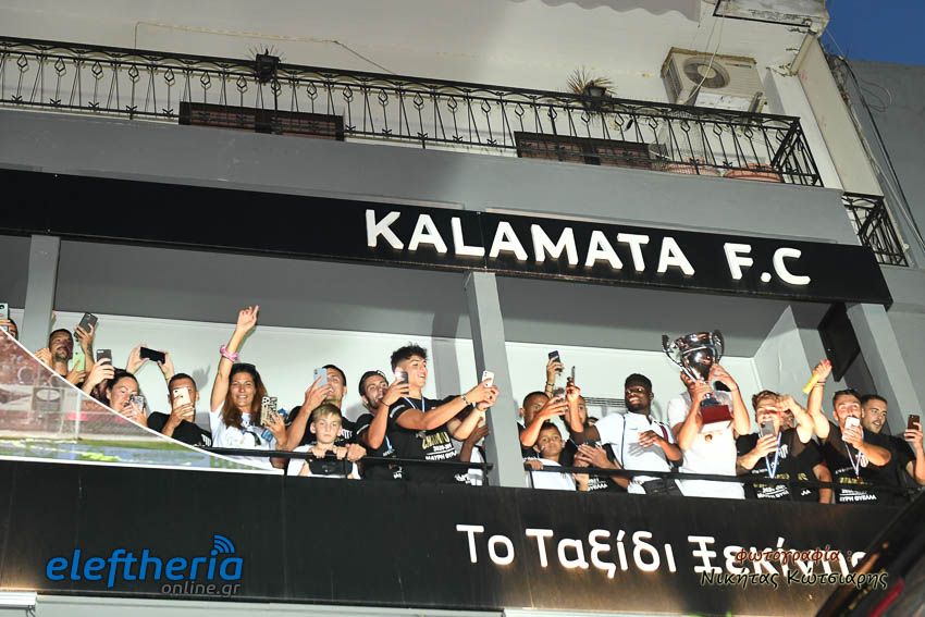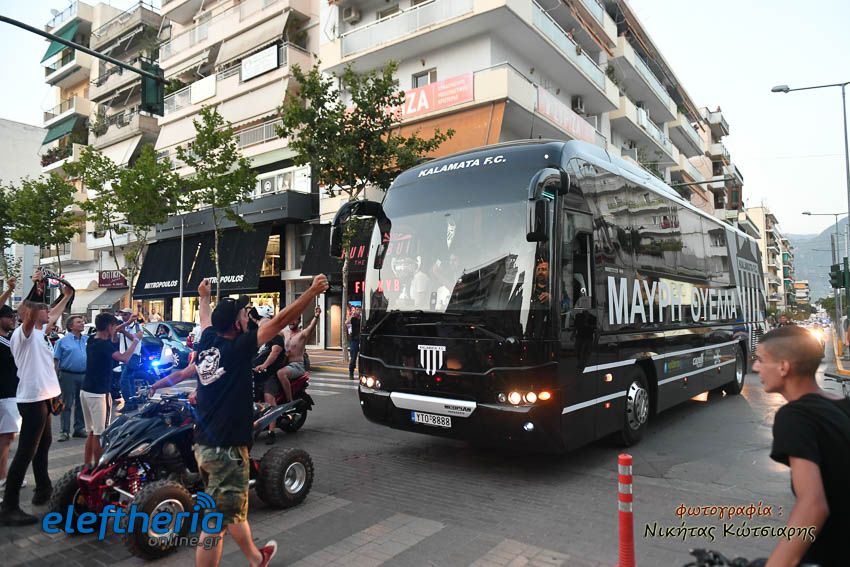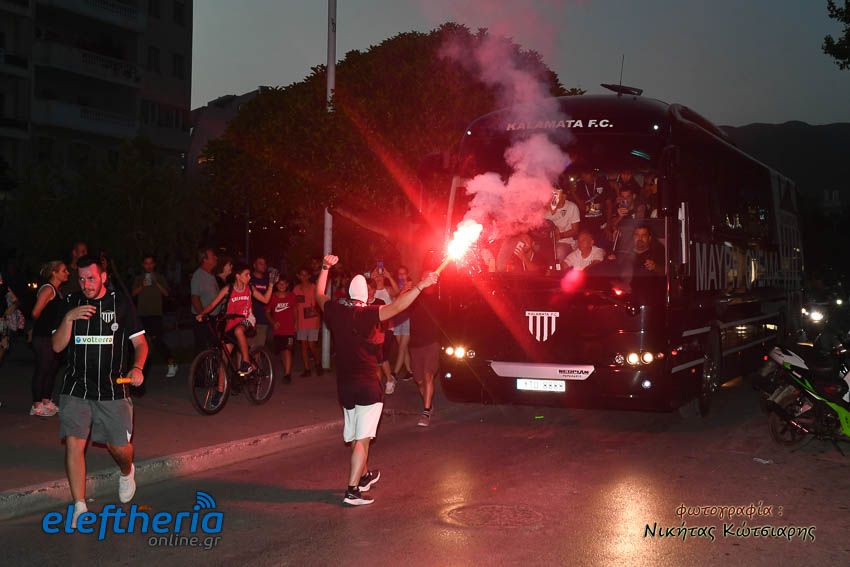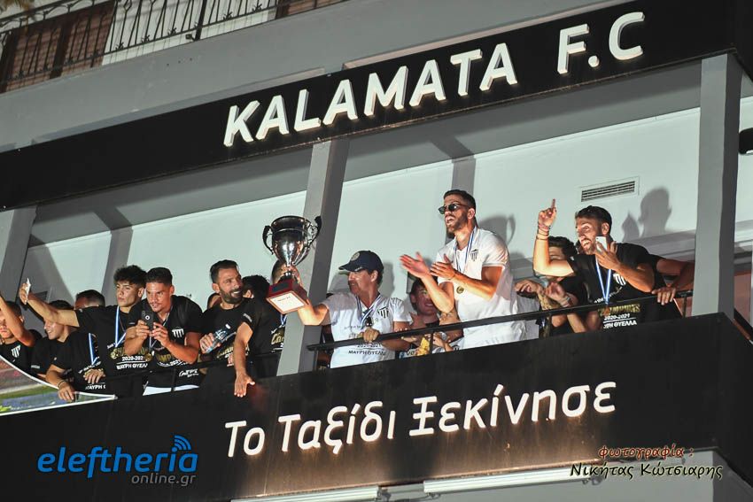 Καπνογόνα, συνθήματα, κορναρίσματα, πανό, σημαίες, συνέθεταν το εντυπωσιακό σκηνικό με τους παίκτες της Καλαμάτας μέσα από το πούλμαν να αποθανατίζουν τις μοναδικές στιγμές. Το πούλμαν αφού έκανε το γύρο της πλατείας, σταμάτησε έξω από τα γραφεία στην Φραντζή, με τη νύχτα να γίνεται... μέρα από τα καπνογόνα. Οι παίκτες ανέβηκαν στα γραφεία και έχοντας το τρόπαιο στα χέρια γνώρισαν την αποθέωση από τον κόσμο που ήταν από κάτω και γιόρταζε τον τίτλο και την άνοδο στη Super League 2.