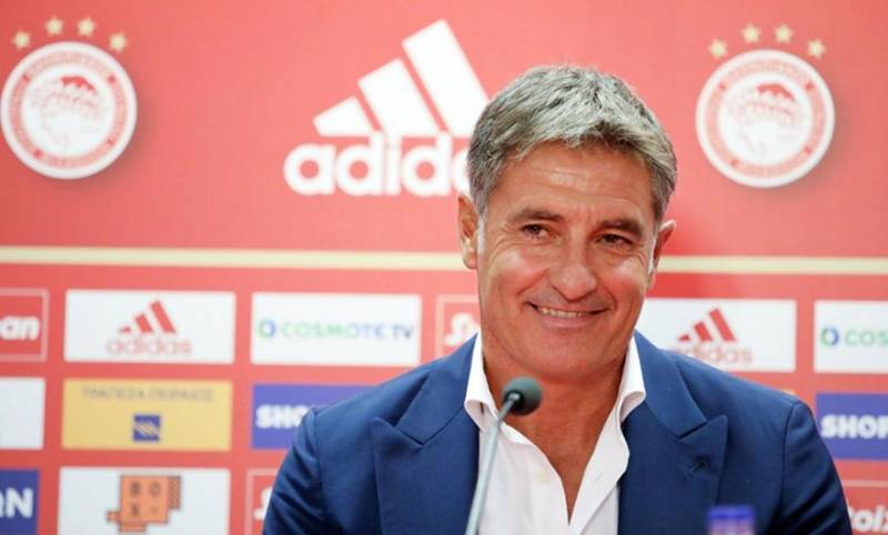 Ο 59χρονος τεχνικός παραχώρησε την πρώτη του συνέντευξη Τύπου ως προπονητής των Πειραιωτών, όπου παρευρέθηκε ο νέος τεχνικός διευθυντής της ομάδας, Ζοζέ Ανιγκό και οι Κριστιάνο Καρεμπέ, Γιάννης Βρέντζος, Αβραάμ Παπαδόπουλος. Την παρουσίαση έκανε ο πρόεδρος της ΠΑΕ, Βαγγέλης Μαρινάκης, ο οποίος είχε μιλήσει νωρίτερα.