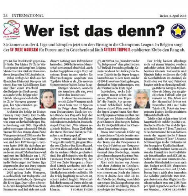 Εκτενές αφιέρωμα στην εξαιρετική πορεία του Αστέρα Τρίπολης στη φετινή Superleague φιλοξενείται στην έκδοση του έγκυρου γερμανικού περιοδικού, «Kicker», το οποίο την αντιπαραβάλλει μ' αυτή της Ζούλτε Βάρεγκεμ στο Βέλγιο.