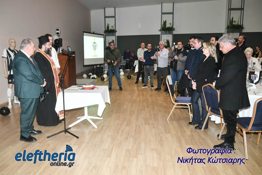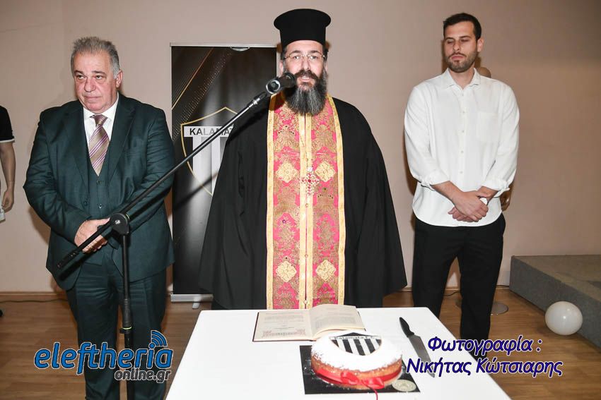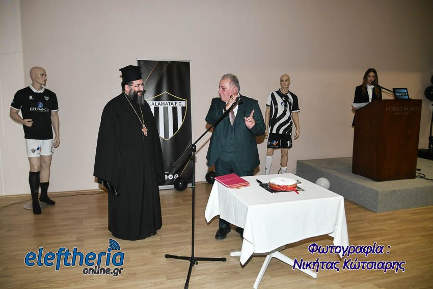 Την πίτα ευλόγησε ο πρωτοσύγκελλος της Μητρόπολης Μεσσηνίας, αρχιμανδρίτης Φίλιππος Χαμαργιάς, έχοντας δίπλα του από την ΠΑΕ τους Γιώργο Ράλλη και Εκτορα Στέφανο. Ο π. Φίλιππος διηγήθηκε μάλιστα μια ιστορία, λέγοντας ότι δεν έχει κλωτσήσει ποτέ μπάλα, αλλά έχει γεννηθεί μέσα στο γήπεδο, μιας και το σπίτι του είναι στο γήπεδο του Ιωνικού στη Νεάπολη. Ετσι σε κάθε παιχνίδι στην ταράτσα του, βρίσκονταν 30-40 άτομα, χωρίς τον ίδιο, αφού είτε ως παπαδάκι, είτε ως ψάλτης και αργότερα ως κληρικός, το πρωί ήταν στην εκκλησία και το μεσημέρι κοιμόταν. Για μια φορά όμως στη ζωή του, βρέθηκε, όπως είπε στην ταράτσα, γιατί έπαιζε ο Ιωνικός με την Καλαμάτα και ως παιδάκι απόρησε πως η ομάδα της ιδιαίτερης πατρίδας του, μπορεί να παίζει σε όλα τα μέρη. Ρώτησε δε τον συγχωρεμένο παππού του, πως η Καλαμάτα μπόρεσε να παίξει στο γήπεδο του Ιωνικού και του απάντησε: Η Καλαμάτα δεν είναι μόνο μαύρη, είναι και θύελλα και η θύελλα σαρώνει τα πάντα”.