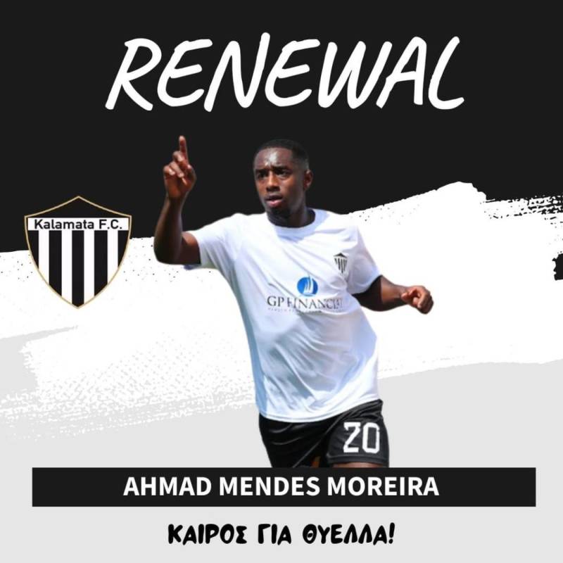 Η ανακοίνωση της ΠΑΕ Καλαμάτα αναφέρει: «Η ΠΑΕ Καλαμάτα είναι στην ευχάριστη θέση να ανακοινώσει την ανανέωση της συνεργασίας της με τον ποδοσφαιριστή Αχμάντ Μέντες Μορέιρα (Ahmad Mendes Moreira) για τον επόμενο χρόνο, με δυνατότητα επέκτασης για ακόμη έναν.