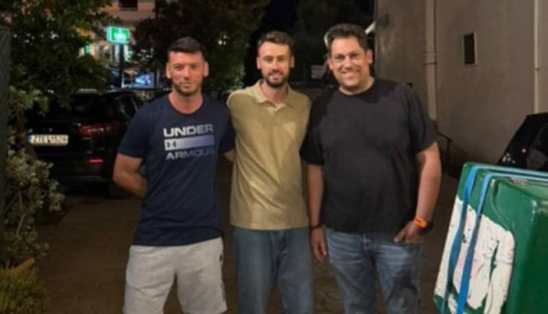Στην φωτογραφία, η «ψυχή» της ομάδας Δημήτρης Πολυμενέας (αριστερά) και ο γραμματέας της ΑΕ Αβίας Δημοσθένης Γκίζας (δεξιά) ποζάρουν στην επιχείρηση που διατηρεί ο Δημήτρης Σκιάς στην παραλία της Παληόχωρας Δυτικής Μάνης, δίνοντας και το στίγμα του οικογενειακού κλίματος που χαρακτηρίζει τον σύλλογο.