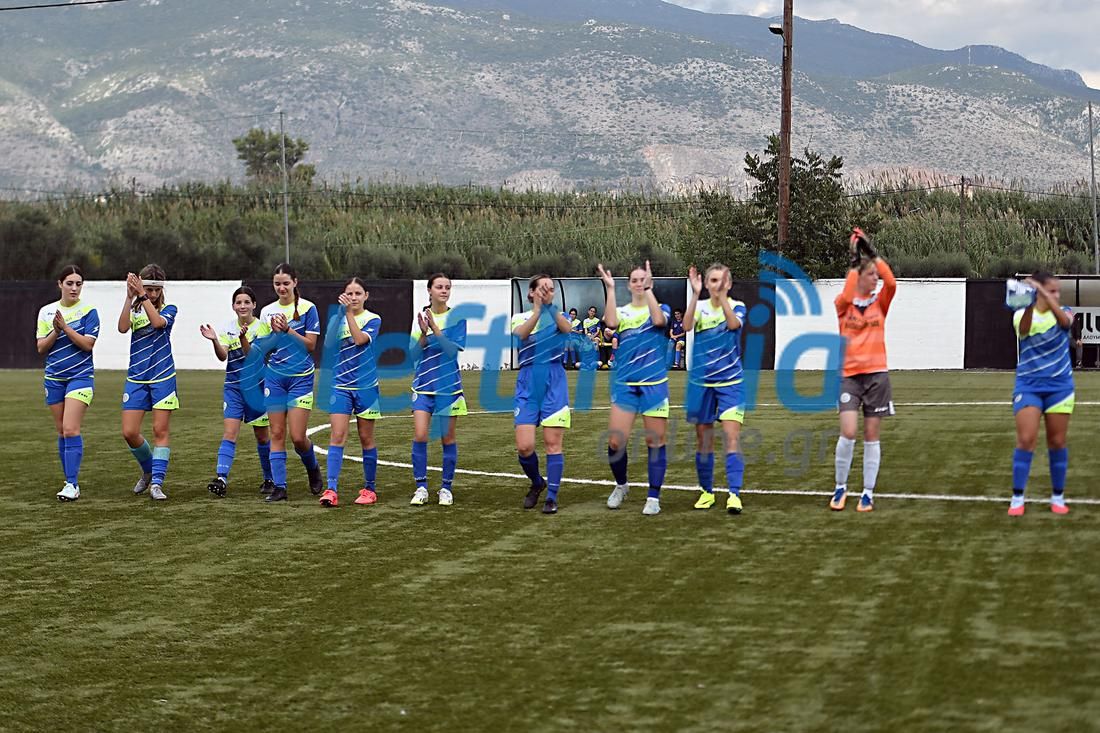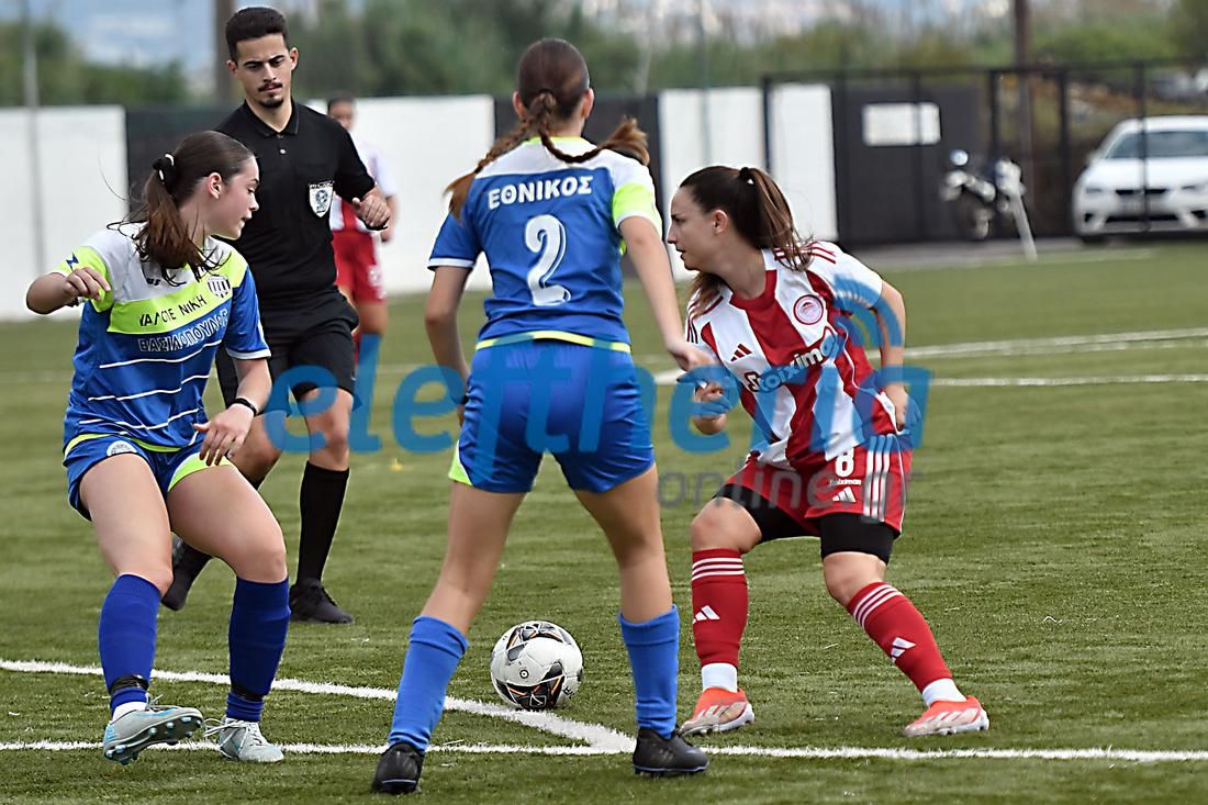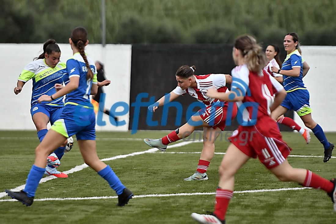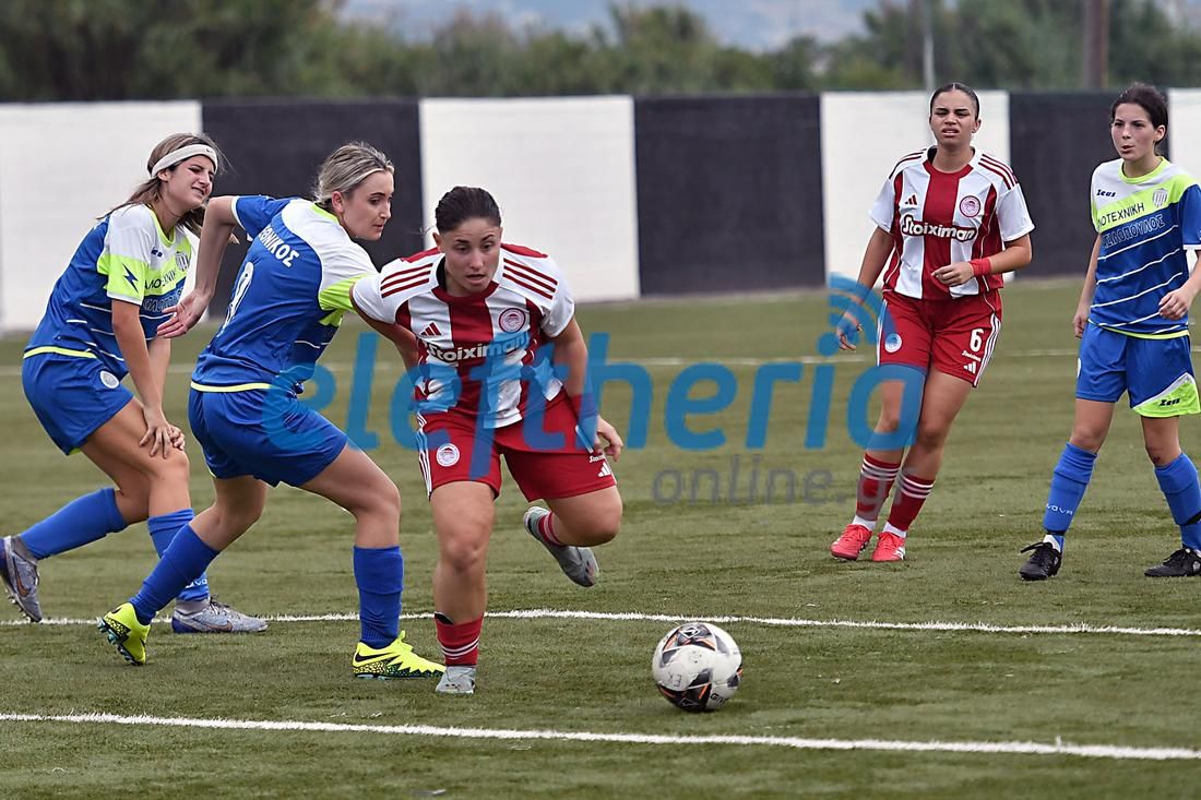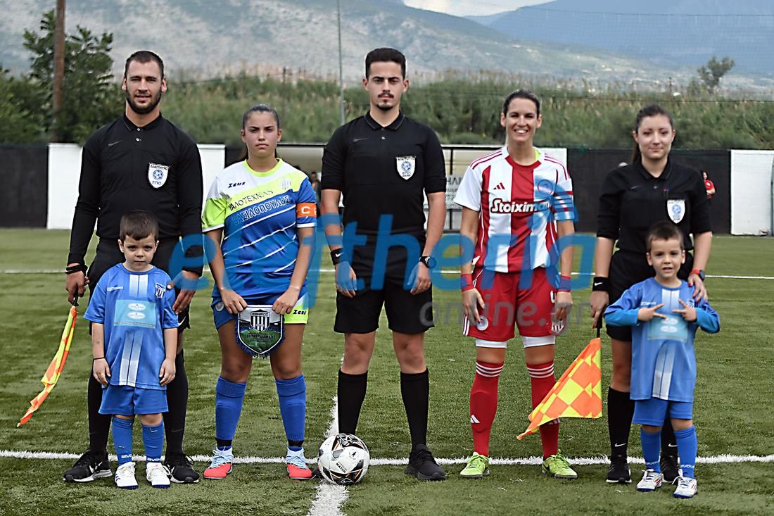 Ο Ολυμπιακός, που έχει συγκροτήσει ένα ιδιαίτερα ποιοτικό σύνολο με στόχο την κατάκτηση του τίτλου στον 4ο όμιλο και μακροπρόθεσμο πλάνο ανόδου στην Α’ Εθνική μέσα στα επόμενα τρία χρόνια, έδειξε από νωρίς τις προθέσεις του. Σκόραρε το πρώτο ιστορικό του γκολ στο 9’ με κεφαλιά της Ματζάνα και προηγήθηκε 4-0 στο ημίχρονο χάρη στα τρία τέρματα της Βενιαμίν (18’, 32’, 34’).