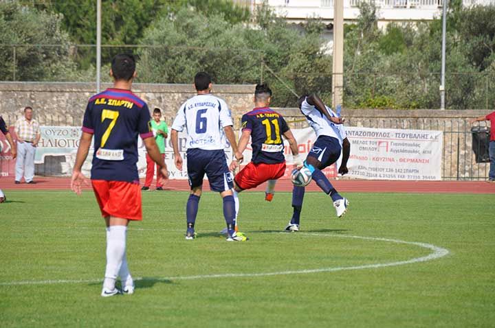 Η Σπάρτη με τον ενθουσιασμό της κερκίδας πέτυχε το γκολ που ήθελε από νωρίς. Το 1-0 από το φάουλ του Σεμερτζίδη στο 7' έδωσε.. φτερά στα πόδια των γηπεδούχων που είχαν την πρωτοβουλία των κινήσεων, με τη Κυπαρισσία να μην μπορεί να κρατήσει μπάλα. Οι απουσίες των Κόλλια, Μιτρόφ, αλλά και τελευταία στιγμή του Γ. Παναγόπουλου επηρέασαν την πρωταθλήτρια Μεσσηνίας, όπως και η θερμή ατμόσφαιρα από 2000 άτομα στο γήπεδο.