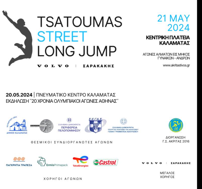 Ενα μοναδικό αθλητικός γεγονός θα φιλοξενήσει η Καλαμάτα τον επόμενο μήνα. Ο λόγος για το "Tsatoumas Street Long Jump" ,που θα διεξαχθεί στις 21 Μαΐου στην κεντρική πλατεία.
