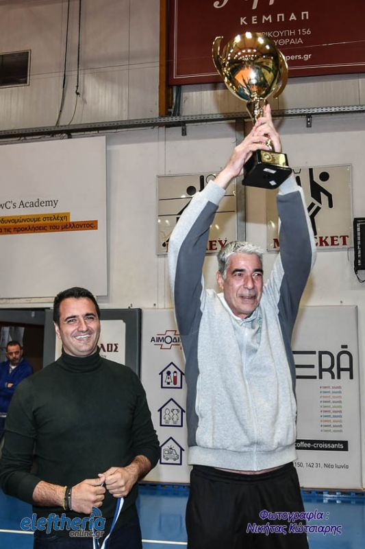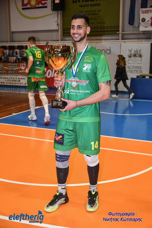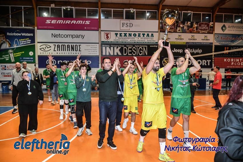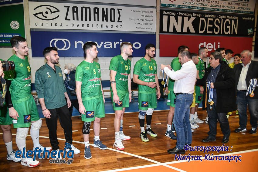 Μετά το τέλος του αγώνα, ο δήμαρχος Καλαμάτας Θανάσης Βασιλόπουλος μαζί με το μέλος της διοίκησης της ΕΟΠΕ Ανδρέα Σωνάκη απένειμαν τα μετάλλια στους παίκτες, το προπονητικό επιτελείο και το υπόλοιπο επιτελείο της ομάδας. Στη συνέχεια, το μέλος της διοίκησης της ΕΟΠΕ Νεκτάριος Χαλβατζής απένειμε το κύπελλο στον αρχηγό της ομάδας Βαγγέλη Ντάκουρη και στη συνέχεια μαζί με τον Κώστα Δαλακούρα το σήκωσαν στον ουρανό δίνοντας το έναυσμα για τα πανηγύρια όλης της αποστολής για την κατάκτηση του τίτλου και της ανόδου στη Volley League. Δευτερόλεπτα μετά την απονομή, από τα μεγάφωνα του κλειστού ακούγοντας και το καλαματιανό κάνοντας το κλίμα ακόμη πιο γιορτινό.