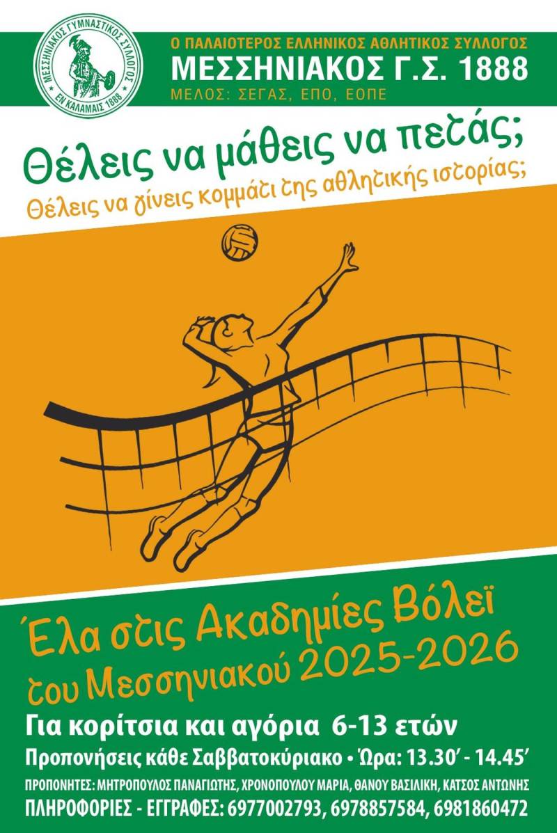 Η ανακοίνωση του συλλόγου αναφέρει: «Αρχίζει το Σάββατο 6 Σεπτεμβρίου 2025 την λειτουργία της η Ακαδημία Βόλεϊ, συνεχίζοντας μια εκπαιδευτική πορεία που ξεκίνησε στις 25/3/1928 όταν για πρώτη φορά οργανώθηκε αγώνας επίδειξης από τον ιστορικό Μεσσηνιακό. Από τότε συνεχίζεται με συνέπεια μέχρι σήμερα η εκπαίδευση αγοριών και κοριτσιών.